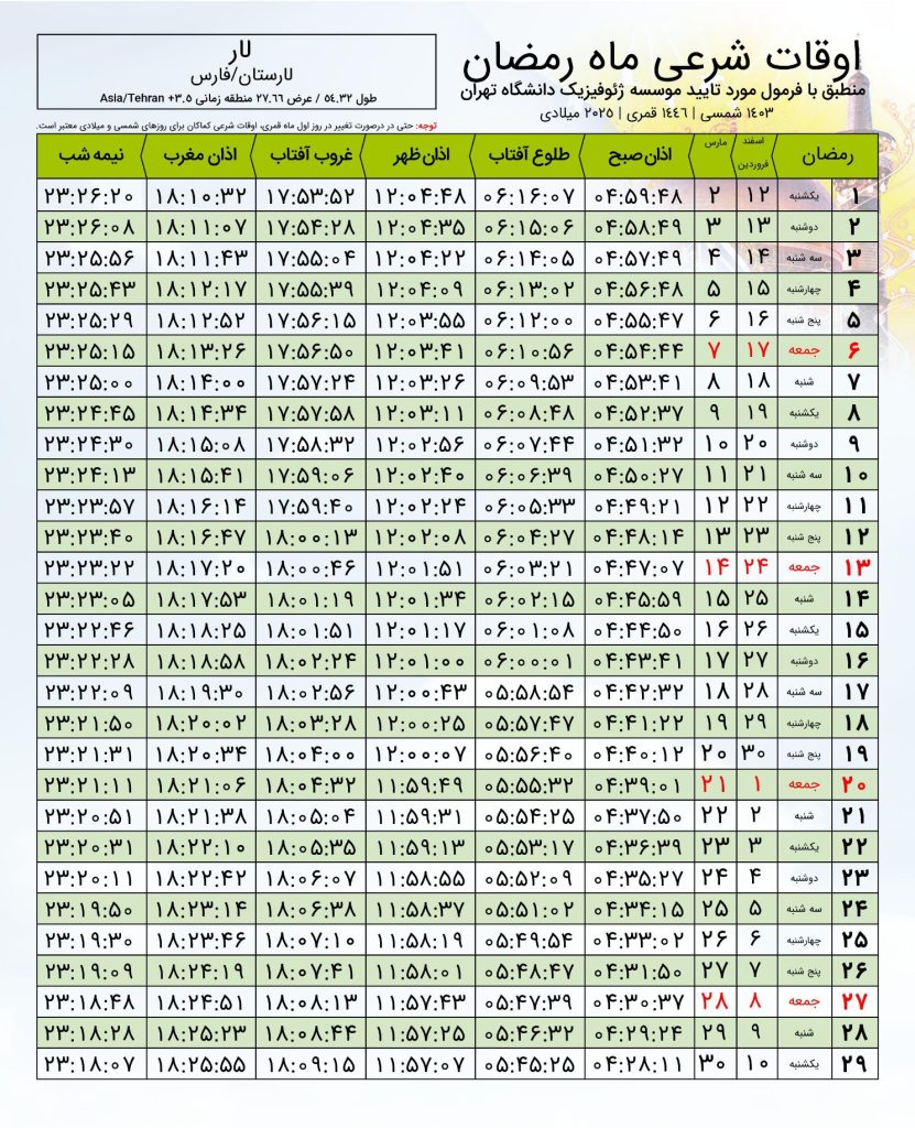 جدول اوقات شرعی ماه مبارک رمضان شهر لار در اسفند 1403 و فروردین 1404 برابر با 1445قمری و 2025 میلادی را که شامل؛ زمان اذان صبح، عصر و مغرب، طلوع و غروب آفتاب باشد بصورت عکس در دسترس بازدیدکنندگان قرار گرفته است.