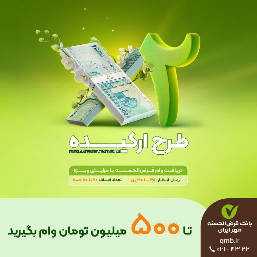 در طرح ارکیده بانک قرض الحسنه مهر ایران، توان مالی خود را ۲ برابر کنید و از وام قرضالحسنه تا سقف ۵۰۰ میلیون تومان بهرهمند شوید.