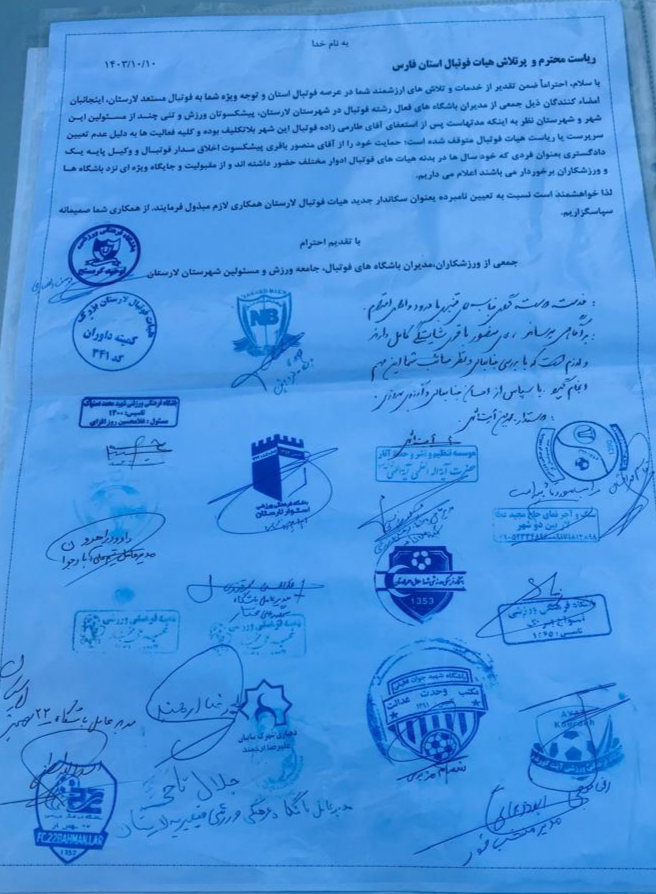 وی با ابراز تأسف نسبت به اینکه امکاناتی که توسط خیرین تأمین و تحویل آقای آقازاده رئیس جدید اداره ورزش لارستان است، چرا تحویل سرپرست جدید هیأت فوتبال نمیشود؟! بیان کرد: رئیس اداره ورزش لارستان حضوری با آقای قنبری رئیس هیأت فوتبال استان فارس رسیده و سرپرستی آقای باقری را پذیرفته اما به آن عمل نمیکند.