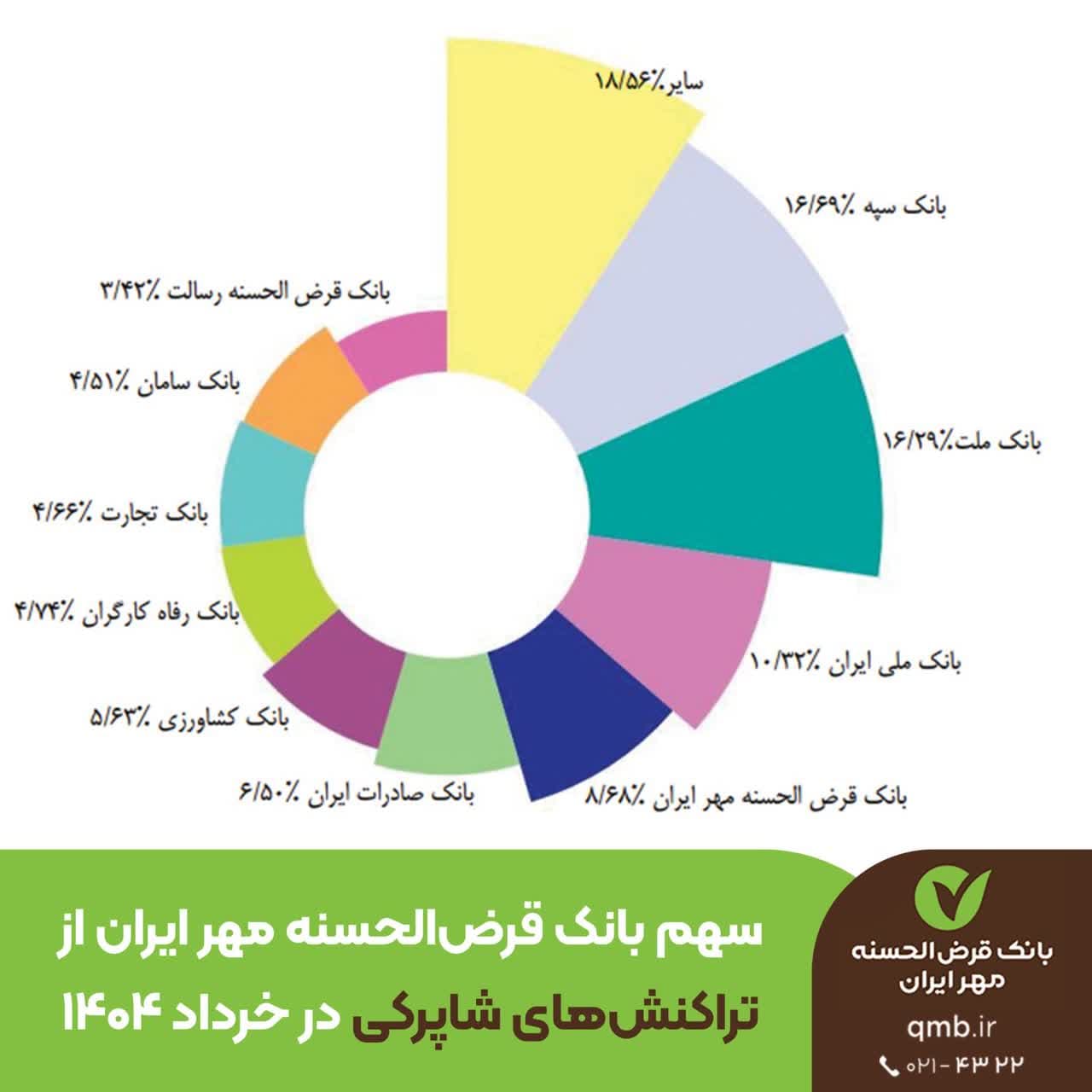 بر اساس گزارش شاپرک، در خرداد ماه ۱۴۰۴، سهم بزگترین بانک قرضالحسنه مهر ایران از تعداد کل تراکنشهای شبکه پرداخت کشور به ۸.۶۸ درصد رسید.