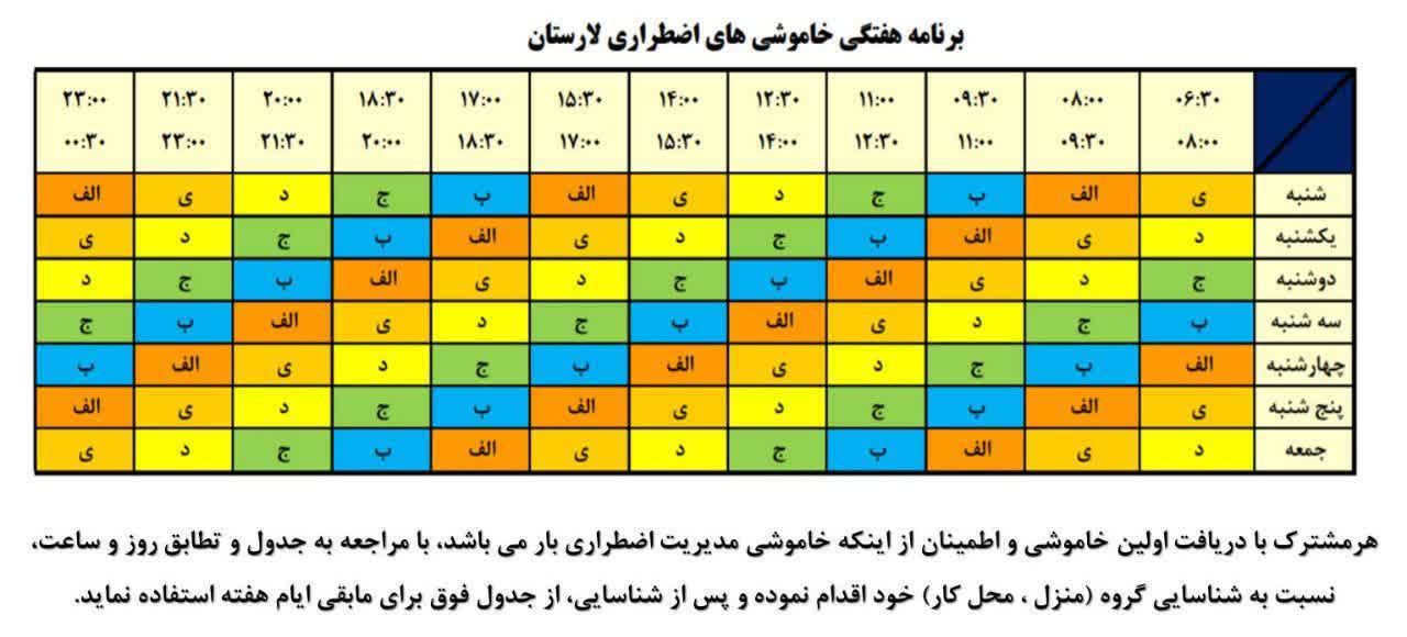 مدیریت توزیع برق لارستان بدینوسیله به اطلاع شهروندان گرامی میرساند؛ بهدلیل افزایش دمای هوا در اکثر مناطق کشور و قرار گرفتن صنعت برق کشور در پیک بار سراسری، میزان ناترازی انرژی افزایش یافته و احتمال رخداد خاموشی ٢ بار در روز برای برخی از مناطق شهرستان طبق جدول اطلاعرسانی قبلی وجود دارد.