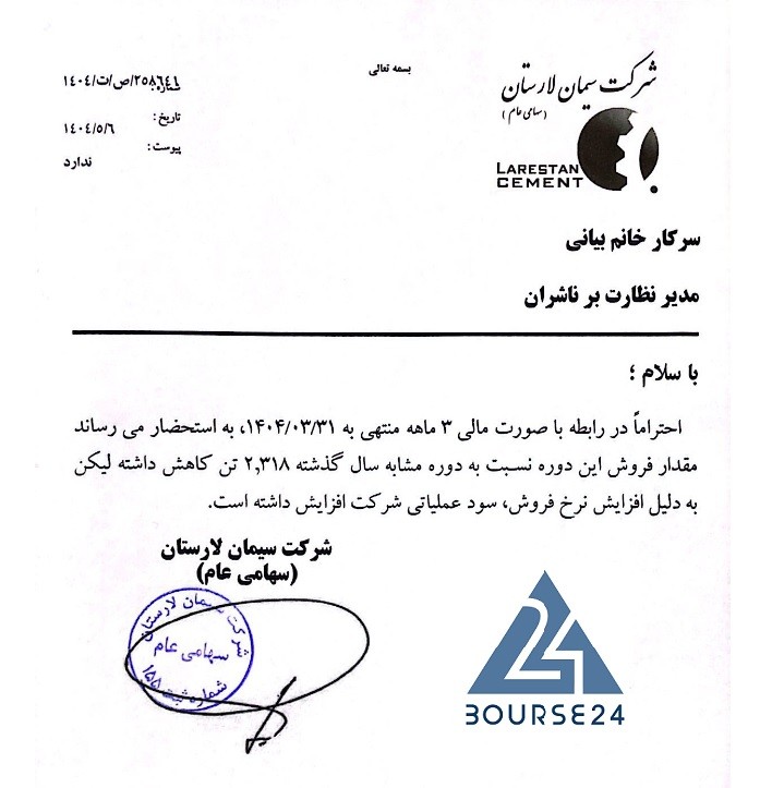 شرکت سیمان لارستان در رابطه با صورتهای مالی ۳ ماهه منتهی به ۳۱ خرداد ماه ۱۴۰۴ توضیح داد.