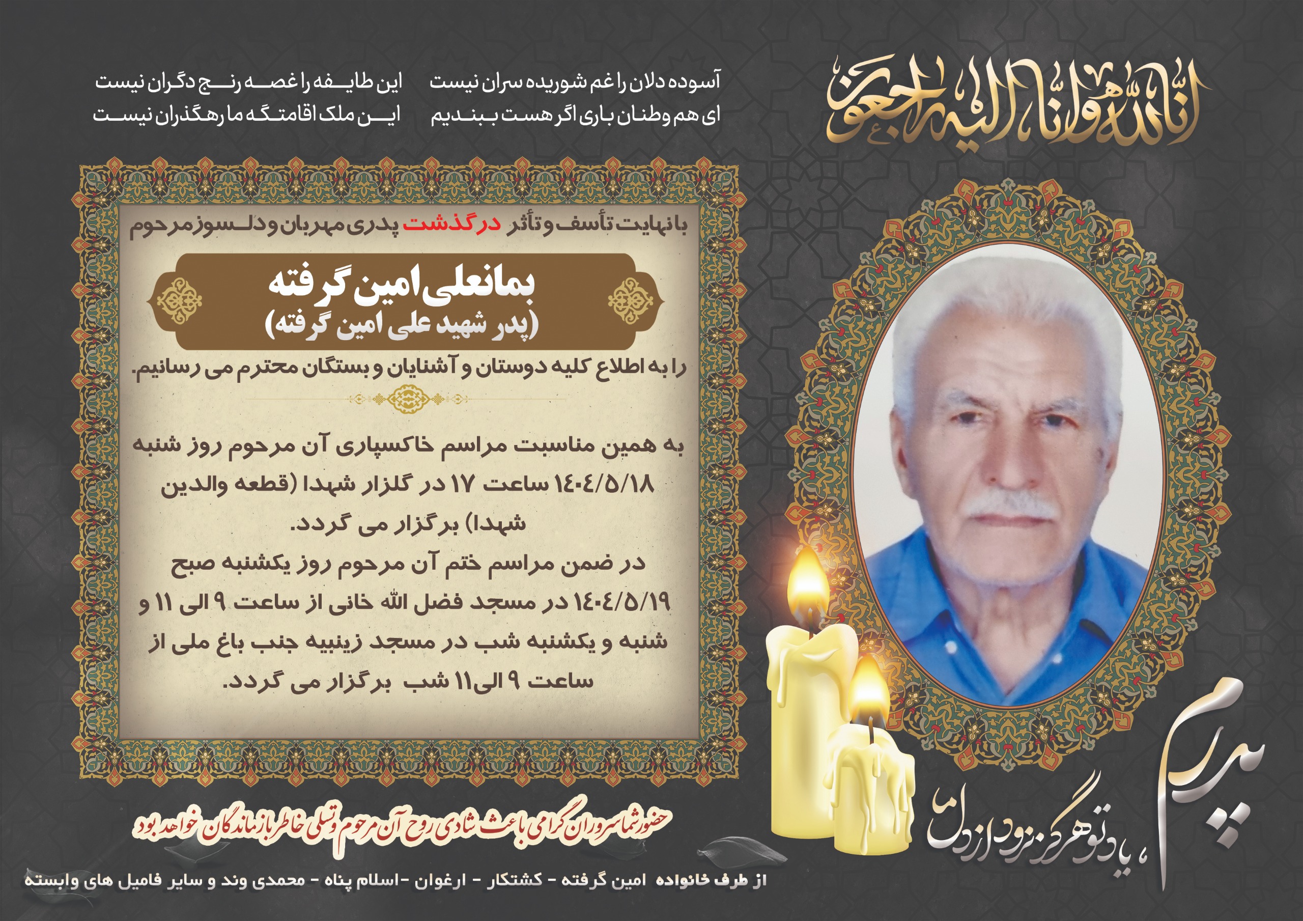 بمانعلی امینگرفته پدر بزرگوار شهید علی امینگرفته به فرزند شهیدش پیوست. به گزارش میلاد لارستان، مراسم تشییع و تدفین این مرحوم عصر روز شنبه ۱۸ مردادماه ۱۴۰۴ ساعت ۱۷…