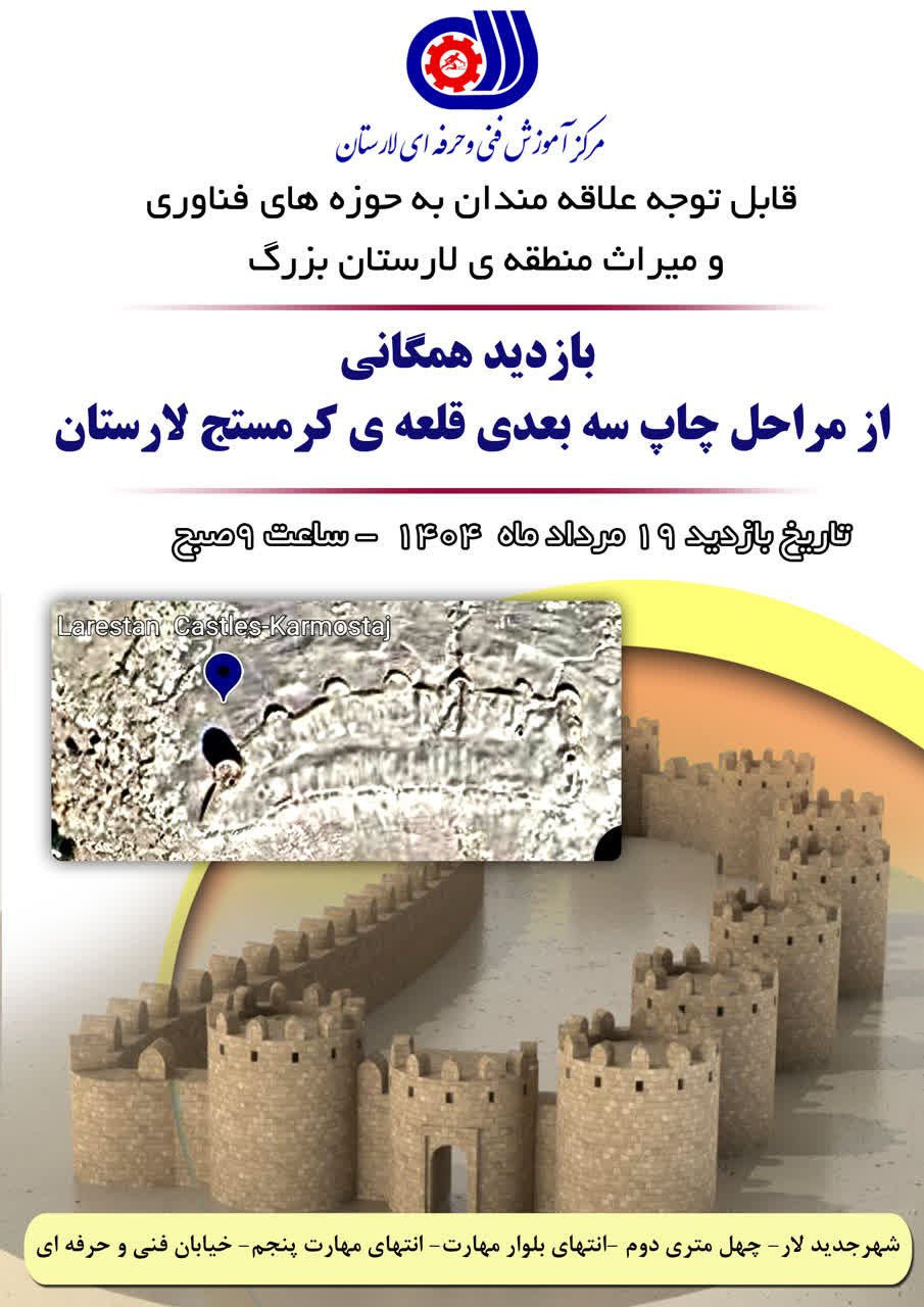 ایزدمهر با اشاره به اقدامات این مرکز در زمینه بومیسازی آموزشهای فنی و توسعه رشتههای معماری و گردشگری، تصریح کرد: «تاکنون آثار تاریخی شاخصی مانند قلعه ساسانی لار، بازار قیصریه، کاروانسراها و سازههای آبی منطقه را با استفاده از چاپ سهبعدی بازسازی کردهایم و اینبار نوبت به احیای قلعه کرمستج رسیده است.»