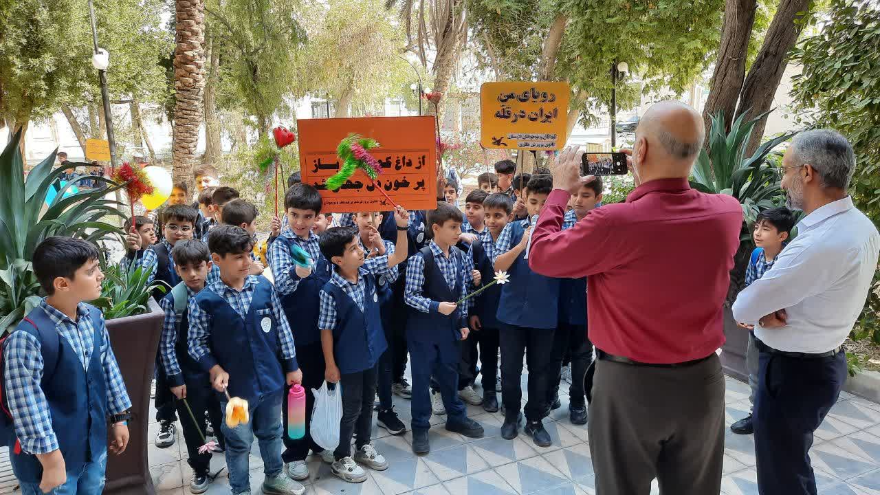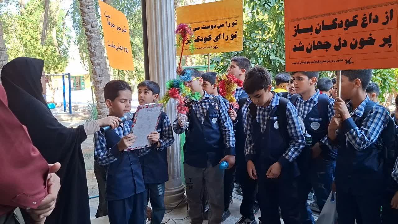 در این مراسم، چندین پلاکارد و تابلو کودکانه با شعارهای پرانرژی و جذاب دیده میشد.