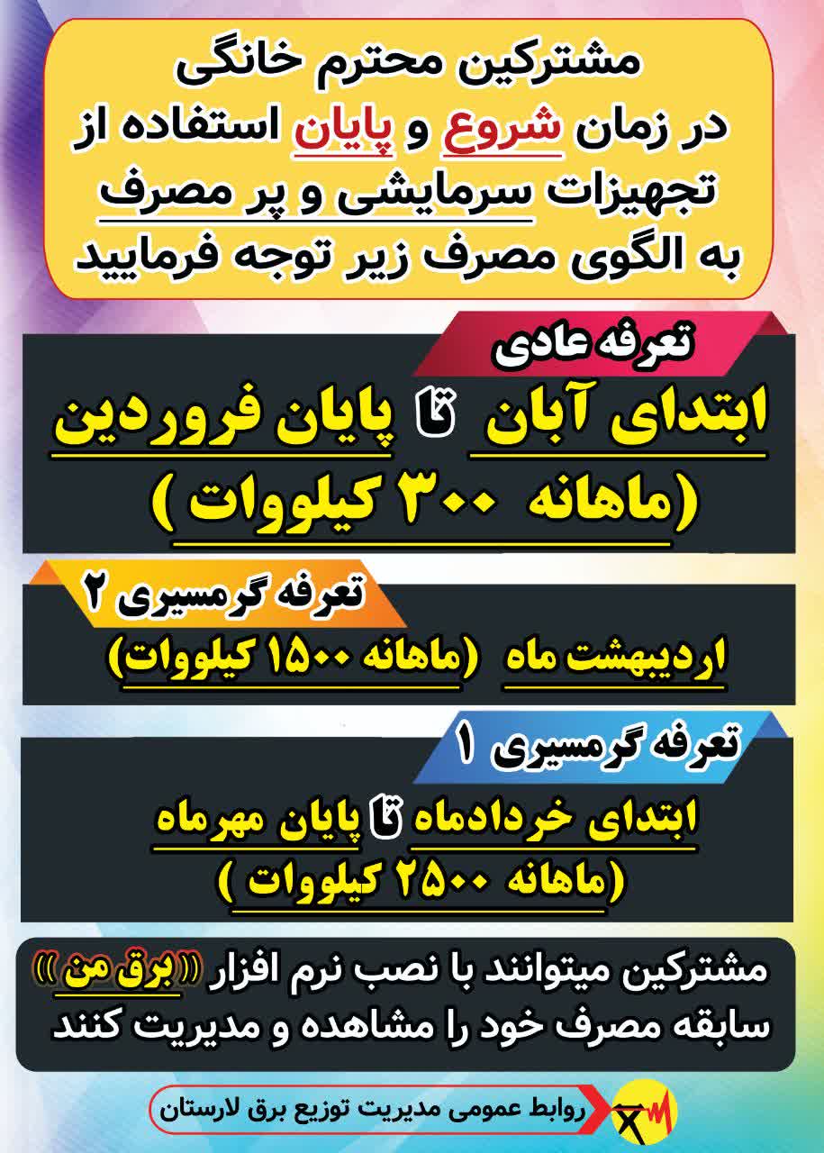 بر اساس آئین نامه تکمیلی تعرفههای برق در شهرستان لارستان، از *ابتدای آبان* مصرف برق خانگی با *تعرفه عادی* محاسبه میگردد. بنابراین استفاده از دستگاههای سرمایشی پرمصرف در این دوره میتواند منجر به افزایش قابل توجه هزینههای قبض برق شود.