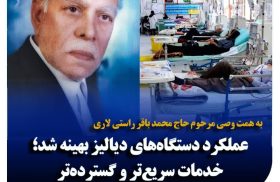به گزارش میلاد لارستان به نقل از وبدا لارستان؛ به همت حاج محمد حسن راستی لاری، وصی مرحوم حاج محمدباقر راستی لاری، مجموعهای از قطعات معیوب دستگاههای دیالیز بیمارستان امام رضا (ع) لار، جایگزین شد.