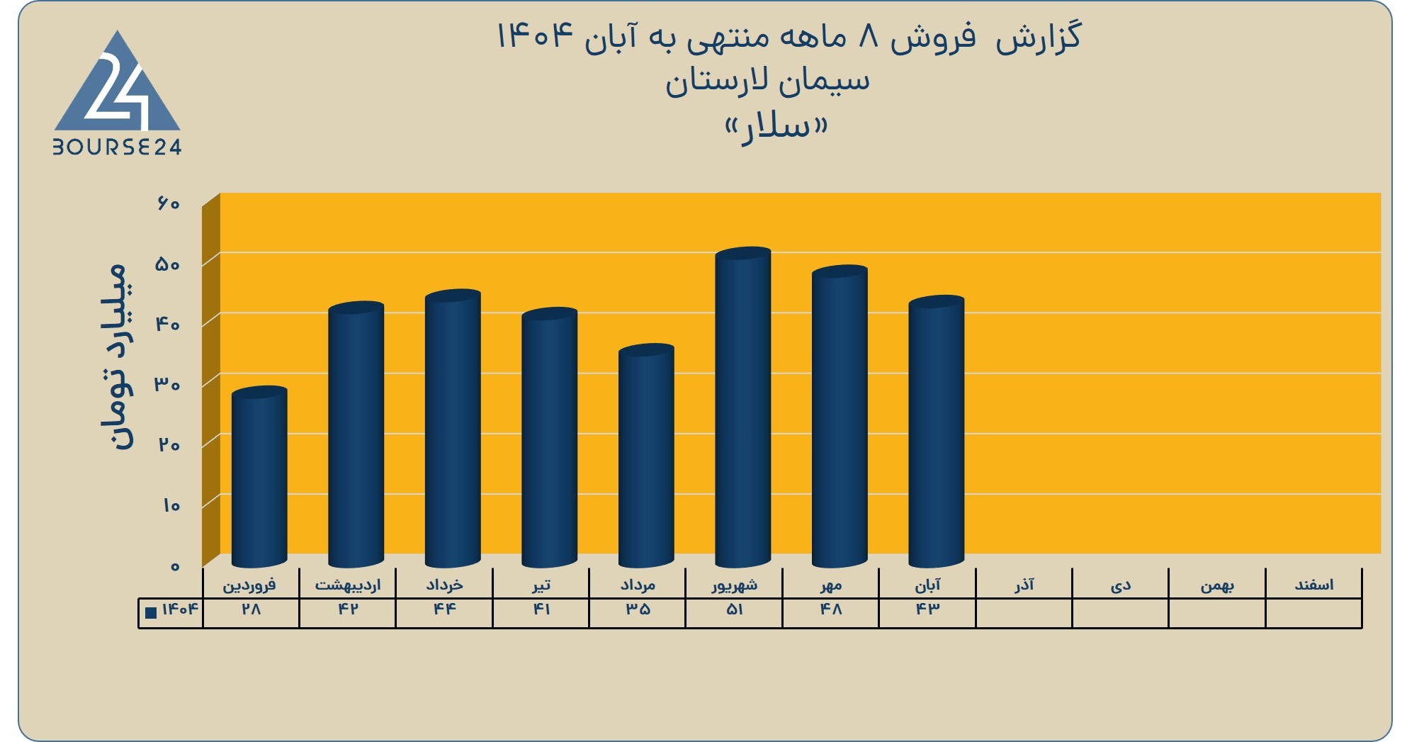 سال مالی شرکت منتهی به اسفند ماه است. لذا شرکت در آذر ماه هر سال علاوه بر انتشار عملکرد آبان عملکرد 8 ماهه خود را نیز منتشر می کند. بر اساس گزارش منتشر شده در سامانه کدال شرکت سیمان لارستان در گزارش عملکرد خود برای آبان در مجموع درآمدی معادل 43 میلیارد تومان شناسایی کرده که بخش عمده ای از این درآمد از محل فروش سیمان درد اخل کشور به دست آمده است و در مقایسه با ماه قبل نیز با کمی افت همراه شد.