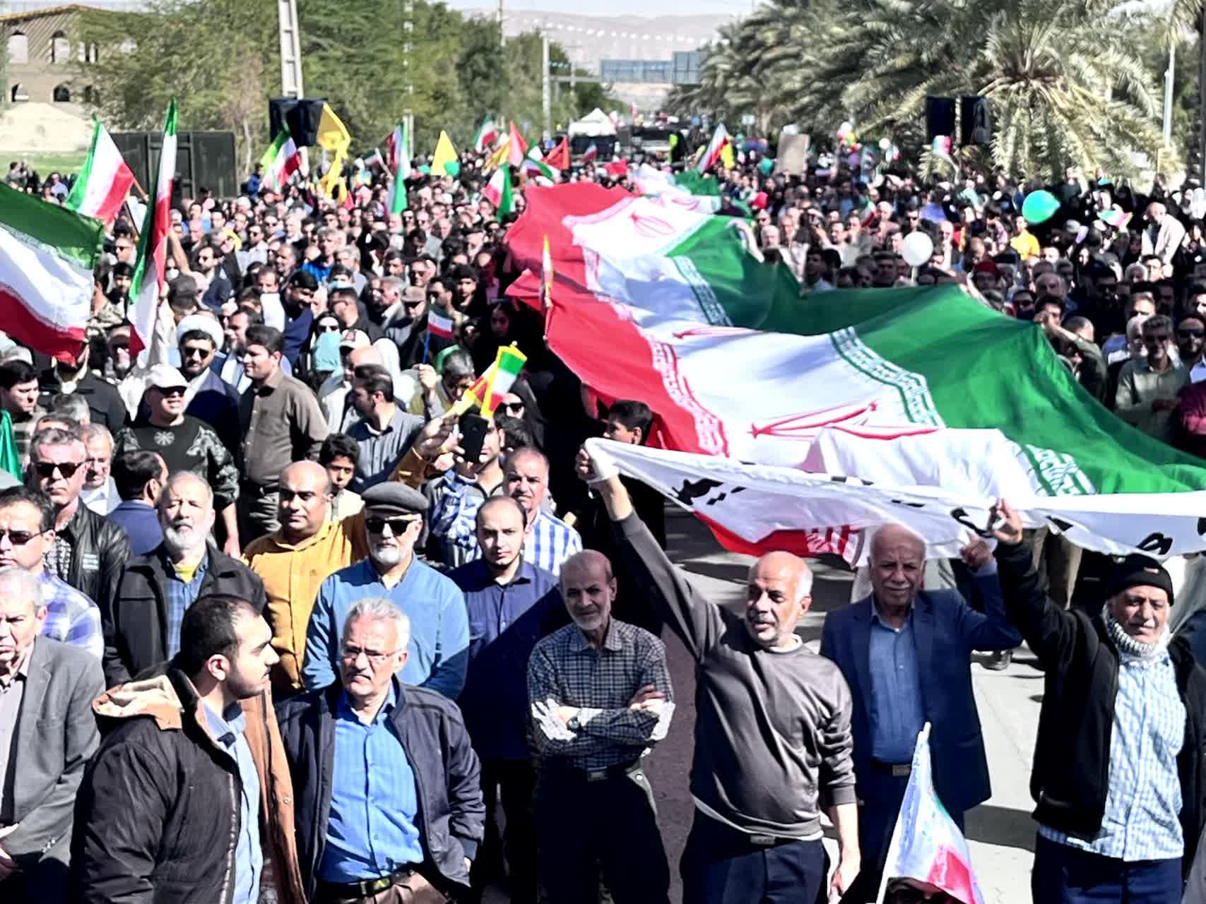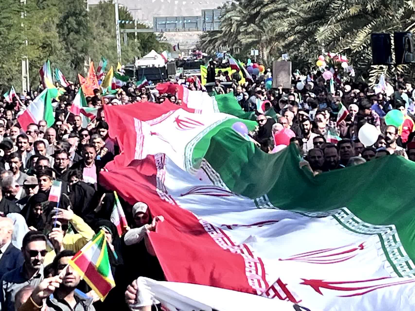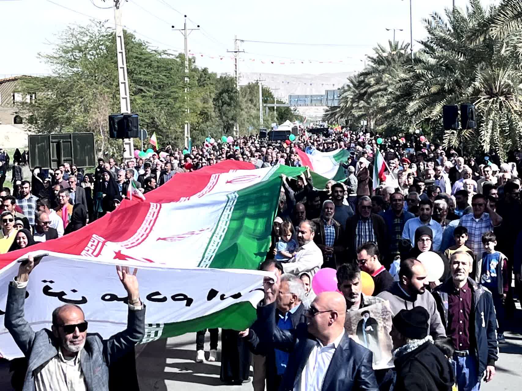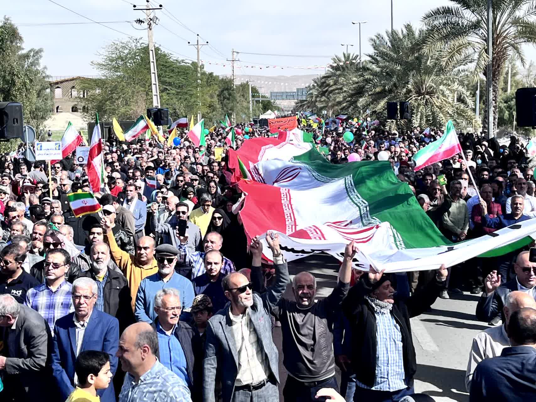 شرکتکنندگان در این آیین باشکوه، تصاویر بنیانگذار کبیر انقلاب اسلامی حضرت امام خمینی رحمهالله علیه، مقام معظم رهبری، شهدای والامقام ایران اسلامی و پرچم مقدس جمهوری اسلامی ایران را در دست داشتند و در حالی که پلاکاردهایی با عناوین یومالله ۲۲ بهمن حمل میکردند، مسیر بلوار سید عبدالحسین لاری را تا میدان امام خمینی رحمهالله علیه پیمودند.