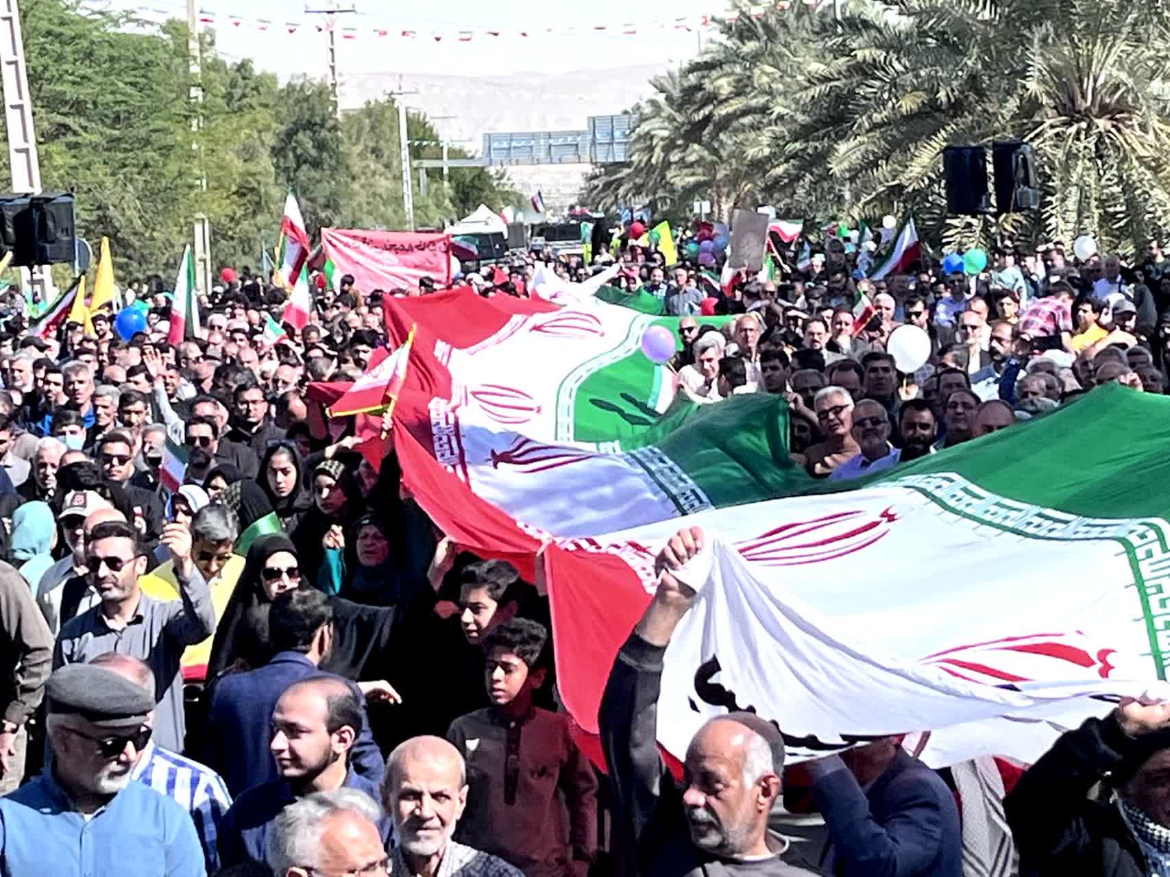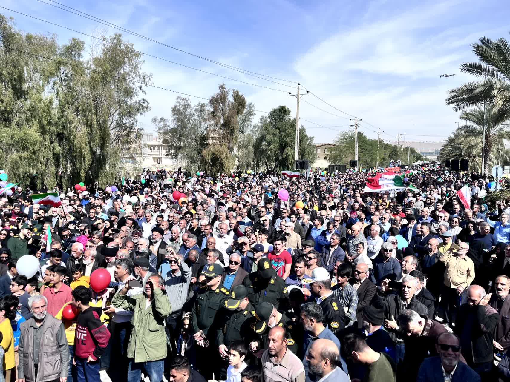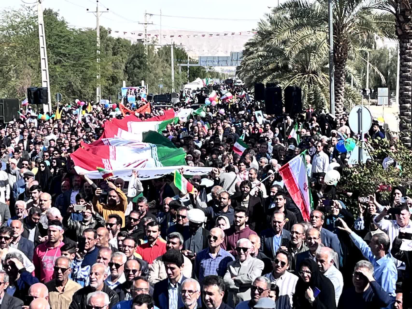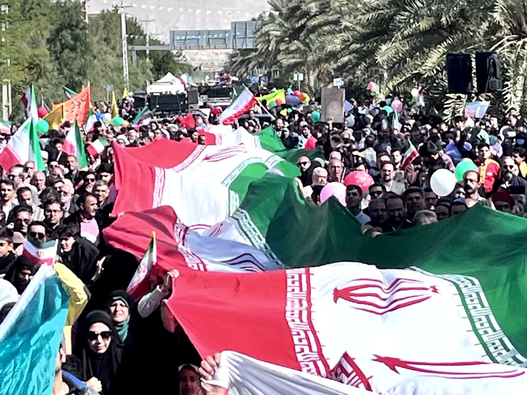 شرکتکنندگان در این آیین باشکوه، تصاویر بنیانگذار کبیر انقلاب اسلامی حضرت امام خمینی رحمهالله علیه، مقام معظم رهبری، شهدای والامقام ایران اسلامی و پرچم مقدس جمهوری اسلامی ایران را در دست داشتند و در حالی که پلاکاردهایی با عناوین یومالله ۲۲ بهمن حمل میکردند، مسیر بلوار سید عبدالحسین لاری را تا میدان امام خمینی رحمهالله علیه پیمودند.