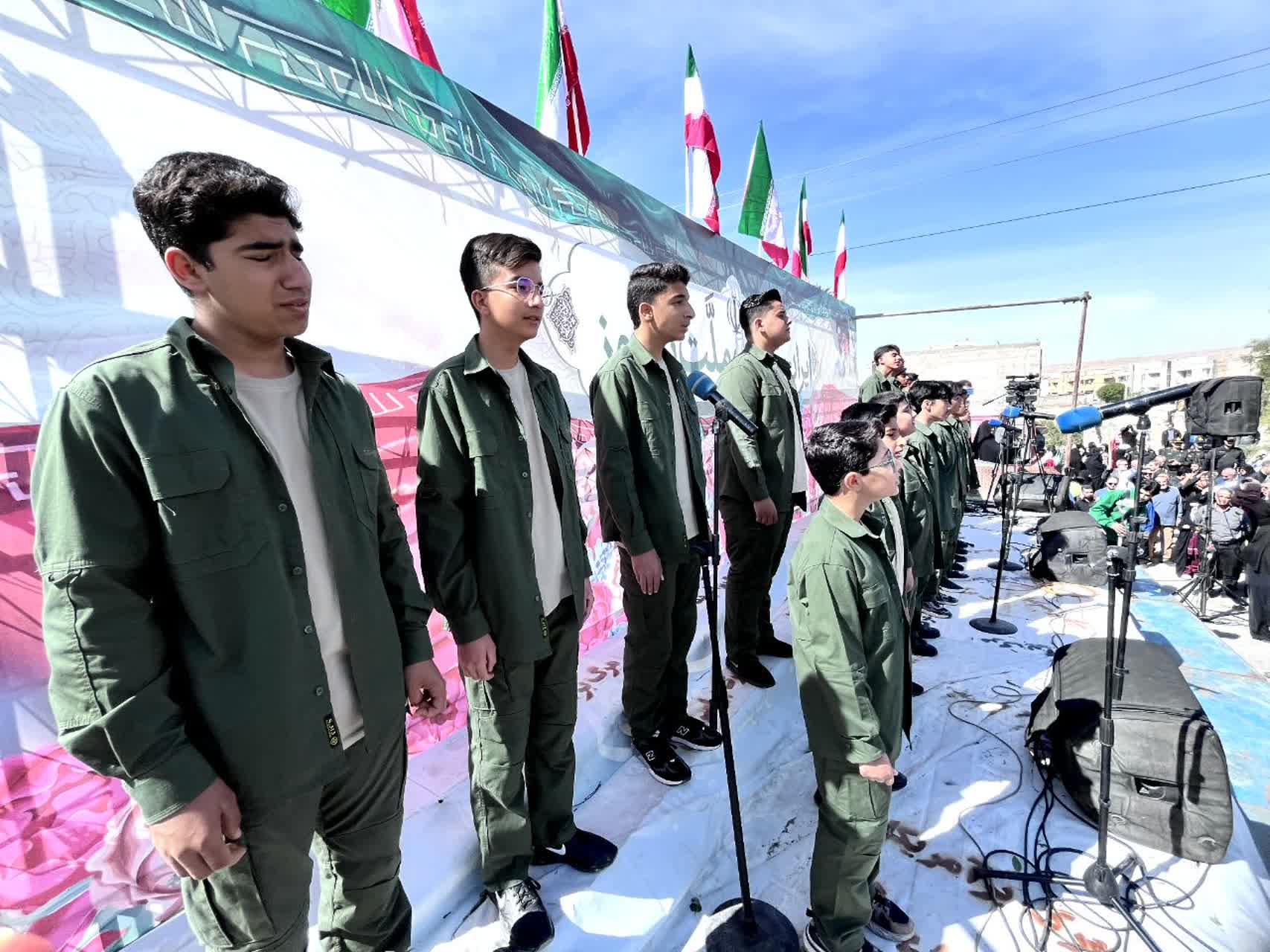 در ورودی میدان امام خمینی رحمهالله علیه، محل پایانی راهپیمایی، گروههای سرود با اجرای برنامههای حماسی و انقلابی حال و هوای مراسم را دوچندان کردند و شور و شعور انقلابی در میان حاضران موج میزد.