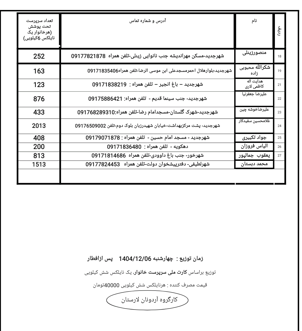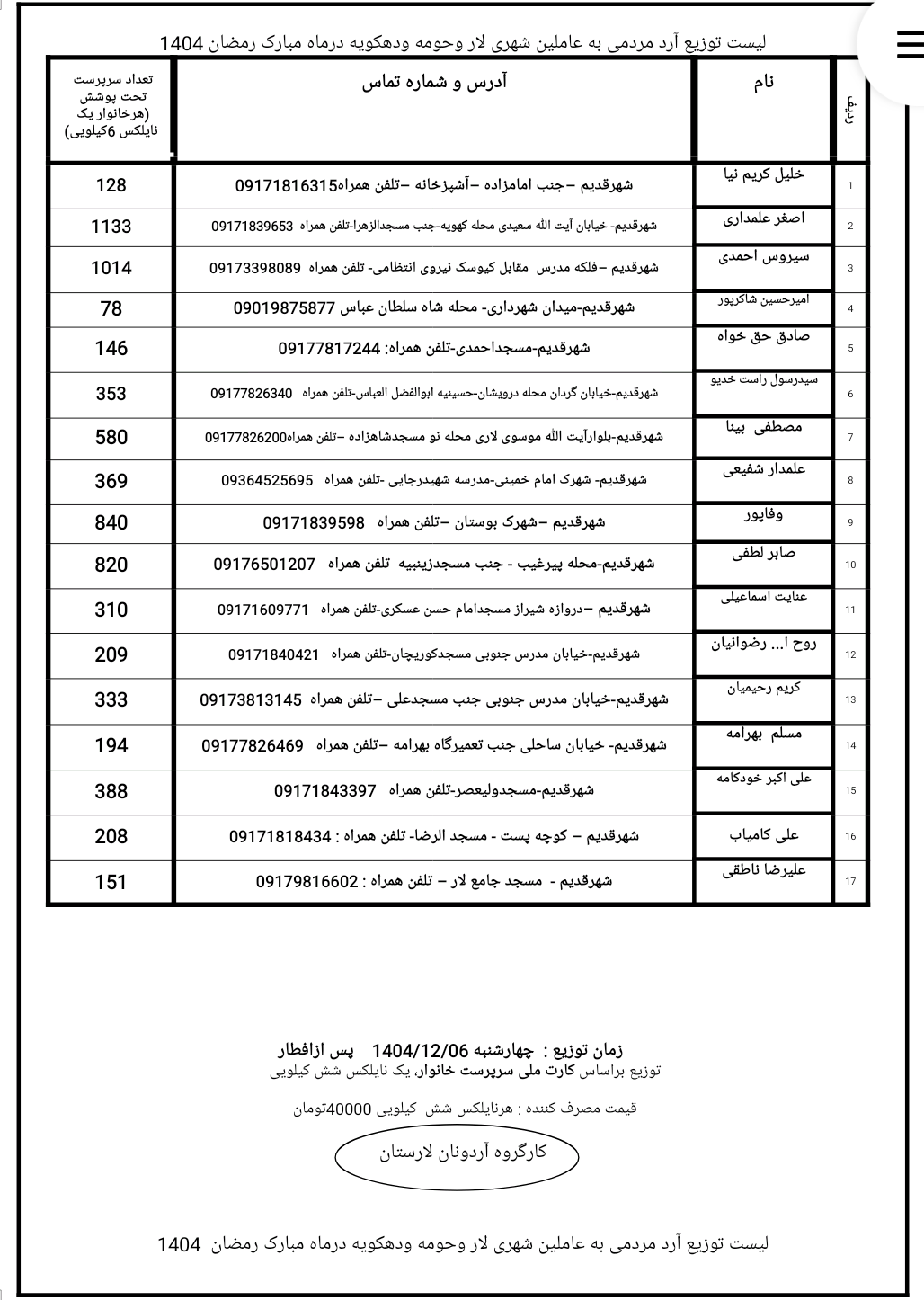 آدرس عاملین توزیع آرد در شهر لار و حومه ویژه ماه مبارک رمضان اعلام شد. ف ۱۱۰